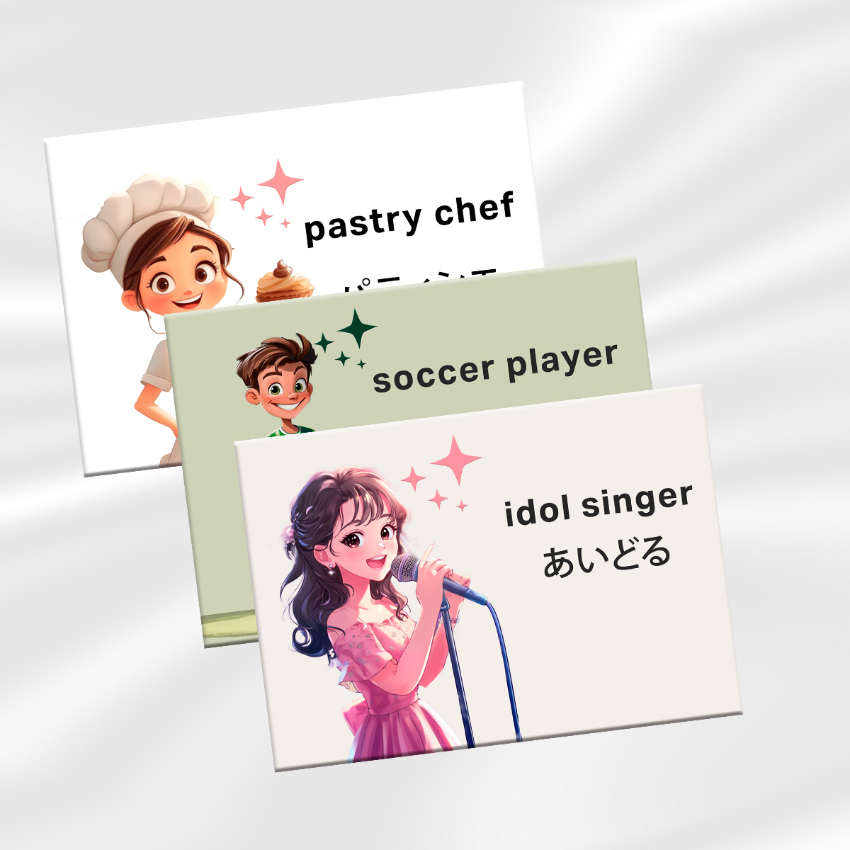 【制作のポイント】こども達が自分の将来の夢を英語で発表する時の手持ちパネルということで、かわいく職業が分かりやすいイラストをMidjorneyを用いて画像生成AIで制作しました。なお、声の小さい子どもでも自信をもって発表できるようにと英語と日本語の両方を記載しています。
