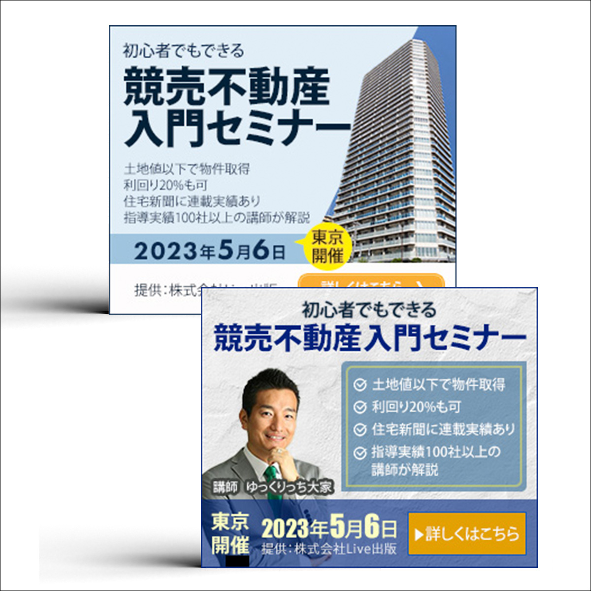 【制作のポイント】配色については不動産関係で多く使われる青系のカラーを採用し、初めての方にも違和感のない色味にしています。文字の大きさや強弱は依頼者の一番伝えたいことやユーザーが必要としている情報(競売不動産入門セミナーと開催日時)を総合的に調整し決定しています。